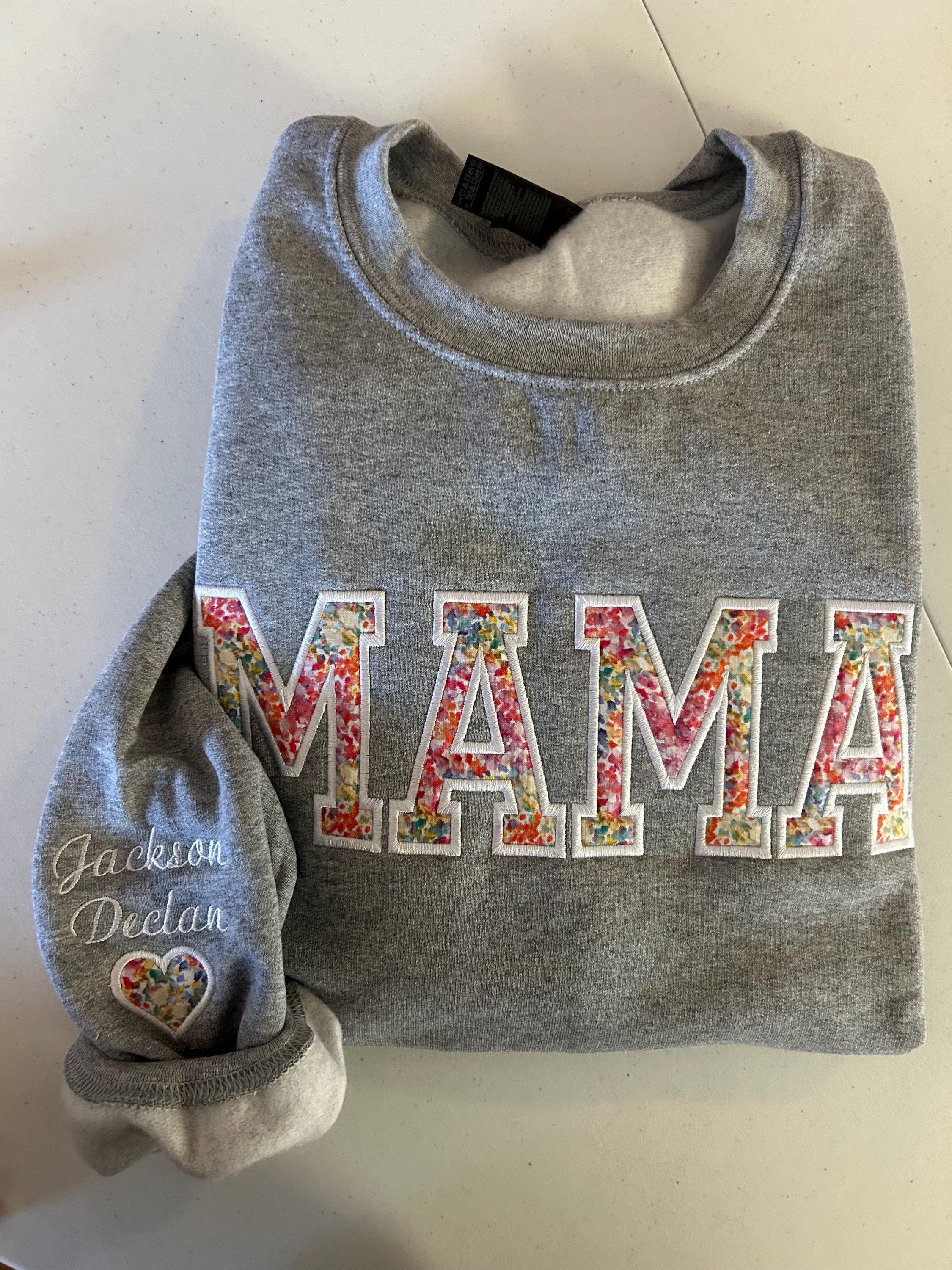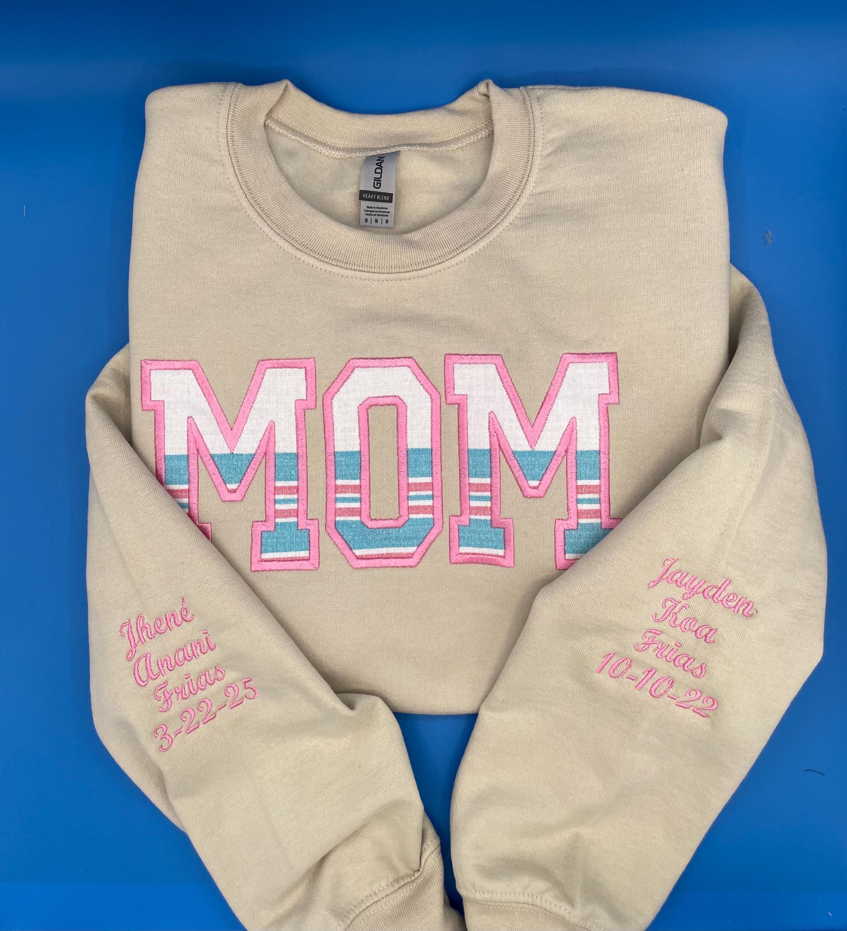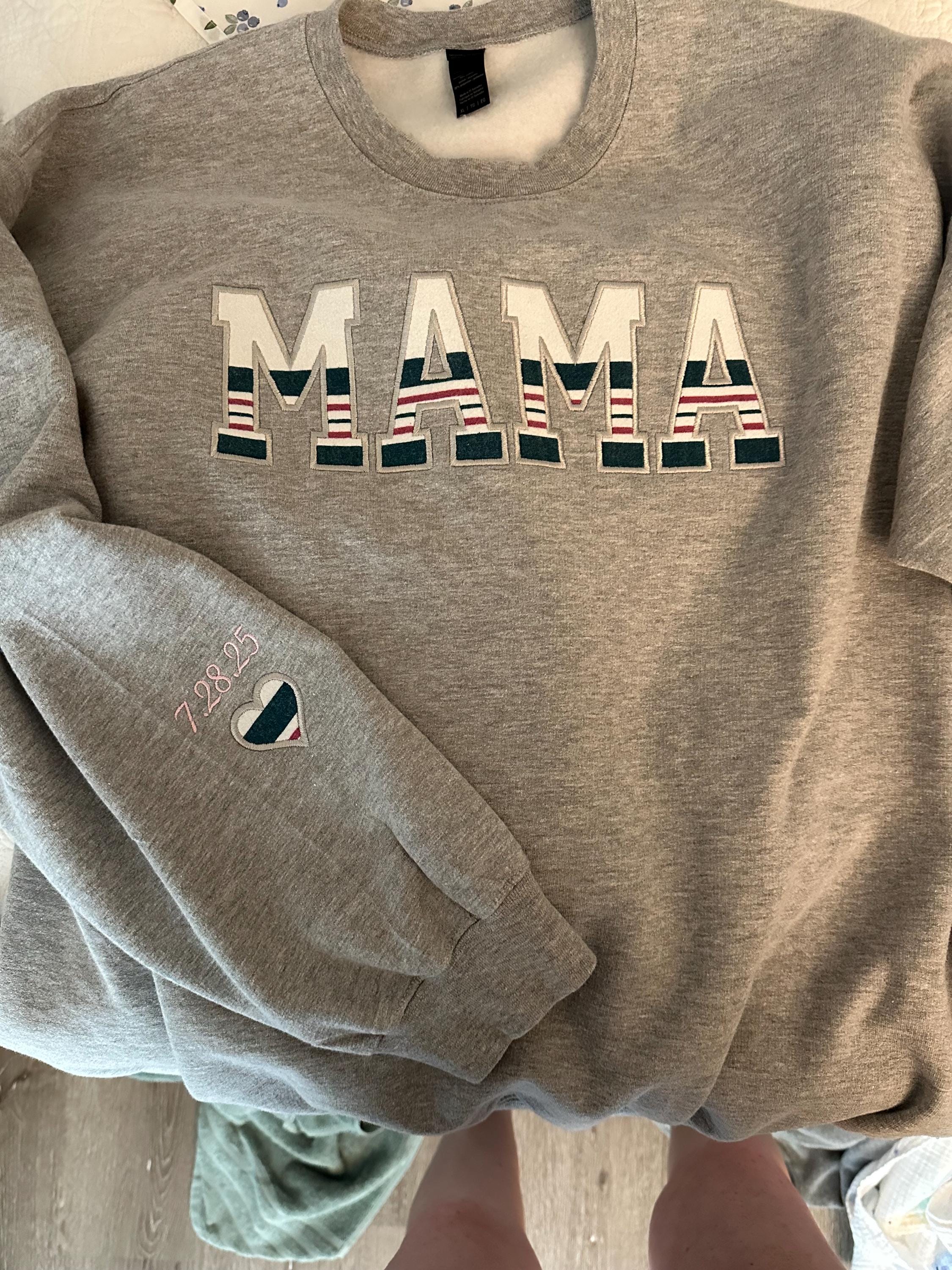 Personalized embroidered MOM applique fleece sweatshirt using your baby's hospital blanket, favorite baby outfit, or any material you would like!